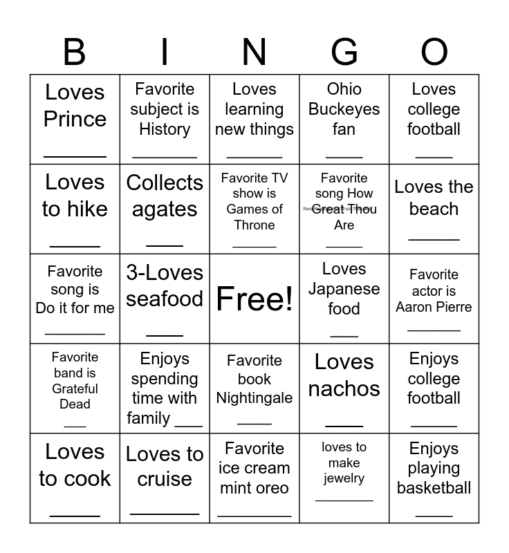 This bingo card has 1 images, a free space and 39 words: Loves music ___, Favorite color is purple ____, Loves Coconuts ____, Collects agates ___, Loves to cook ____, Favorite book Nightingale ____, Favorite TV show is Games of Throne ______, Favorite singer is Whitney Houston, Loves college football ____, Favorite band is Grateful Dead ___, 3-Loves seafood ___, Ohio Buckeyes fan ____, Enjoys playing basketball ____, Favorite actor is Aaron Pierre _______, Loves Japanese food ___, Enjoys spending time with family ___, favorite tree-Palm tree _____, Loves Prince _____, Loves 80's and 90's country music ____, Loves nachos ___, Loves to hike ____, Favorite ice cream mint oreo ________, Favorite song How Great Thou Are _____, Loves the beach _____, 3-loves seafood ______, 2-loves to cook, Loves to travel _______, Favorite movie is Interstellar _____, Loves John Hughes movies _________, Favorite subject is History _______, Favorite book The Family Business ______, Loves to grill ______, Loves learning new things ______, Loves to cruise ______, loves to make jewelry ________, favorite song Don't stop Believing ____, Enjoys college football _____, Favorite song is Do it for me _______ and Enjoys Nascar ____.