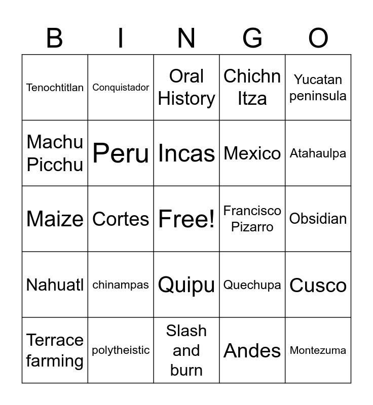 This bingo card has a free space and 24 words: chinampas, polytheistic, Incas, Terrace farming, Yucatan peninsula, Tenochtitlan, Machu Picchu, Conquistador, Francisco Pizarro, Quipu, Mexico, Maize, Quechupa, Cusco, Peru, Andes, Obsidian, Oral History, Atahaulpa, Cortes, Montezuma, Nahuatl, Chichn Itza and Slash and burn.