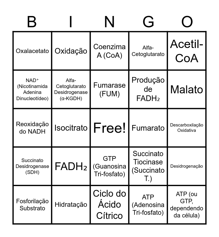 This bingo card has a free space and 36 words: Citrato Sintase (CS), Aconitase (ACN), Isocitrato Desidrogenase (IDH), Alfa-Cetoglutarato Desidrogenase (α-KGDH), Succinato Tiocinase (Succinato T.), Succinato Desidrogenase (SDH), Fumarase (FUM), Malato Desidrogenase (MDH), Acetil-CoA, Ácido Cítrico, Isocitrato, Alfa-Cetoglutarato, Succinato, Fumarato, Malato, Oxalacetato, NADH, FADH₂, ATP (ou GTP, dependendo da célula), Coenzima A (CoA), Descarboxilação Oxidativa, Desidrogenação, Hidratação, Fosforilação Substrato, Ciclo do Ácido Cítrico, Oxidação, Reoxidação do NADH, Produção de NADH, Produção de FADH₂, NAD⁺ (Nicotinamida Adenina Dinucleotídeo), FAD (Flavina Adenina Dinucleotídeo), CoA (Coenzima A), ATP (Adenosina Tri-fosfato), GTP (Guanosina Tri-fosfato), NADH (Nicotinamida Adenina Dinucleotídeo Hidrogenado) and FADH₂ (Flavina Adenina Dinucleotídeo Hidrogenado).