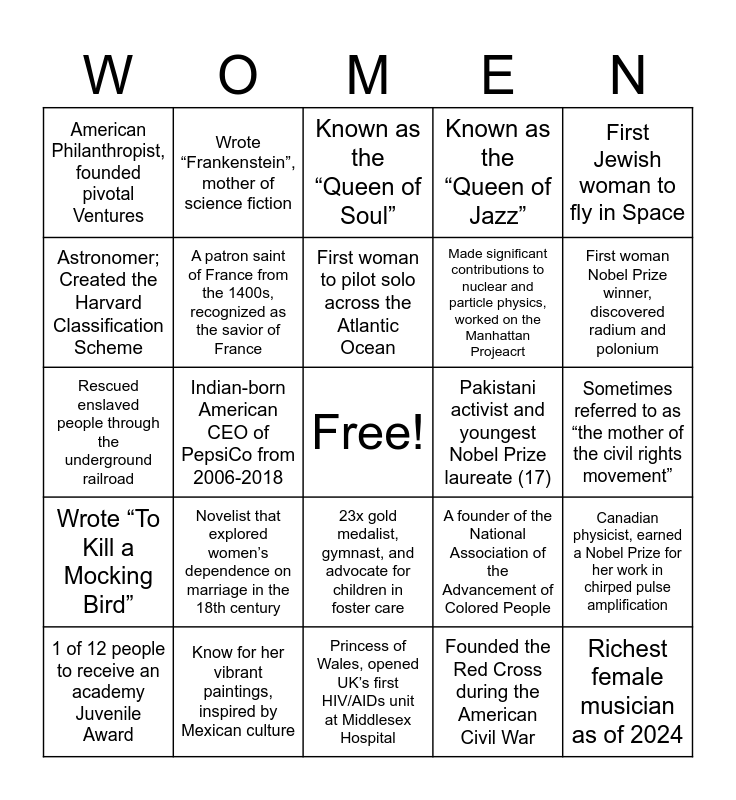 This bingo card has a free space and 34 words: First Chinese American film star in Hollywood, Founded the Red Cross during the American Civil War, Country Singer who created the Imagination Library Program, Described as the most important woman in the history of mathematics, Wrote “To Kill a Mocking Bird”, A patron saint of France from the 1400s, recognized as the savior of France, First Jewish woman to fly in Space, 1 of 12 people to receive an academy Juvenile Award, Wrote “Frankenstein”, mother of science fiction, In her teens, helped the Lewis and Clark expedition, First woman to pilot solo across the Atlantic Ocean, Known as the “Queen of Soul”, Founder and Chief Executive Officer of Pearls Africa Youth, Considered the world’s expert on Chimpanzees, Pakistani activist and youngest Nobel Prize laureate (17), First woman Nobel Prize winner, discovered radium and polonium, Know for her vibrant paintings, inspired by Mexican culture, Rescued enslaved people through the underground railroad, Novelist that explored women’s dependence on marriage in the 18th century, A founder of the National Association of the Advancement of Colored People, 23x gold medalist, gymnast, and advocate for children in foster care, Known as the “Queen of Pop”, American Philanthropist, founded pivotal Ventures, Sometimes referred to as “the mother of the civil rights movement”, Princess of Wales, opened UK’s first HIV/AIDs unit at Middlesex Hospital, Richest female musician as of 2024, Known as the “Queen of Jazz”, Won the 2024 WNBA Rookie of the Year award, Made significant contributions to nuclear and particle physics, worked on the Manhattan Projeacrt, Astronomer; Created the Harvard Classification Scheme, First deaf-blind person in the US to earn a college degree, Indian-born American CEO of PepsiCo from 2006-2018, Canadian physicist, earned a Nobel Prize for her work in chirped pulse amplification and One of the most well known tennis players of our time.