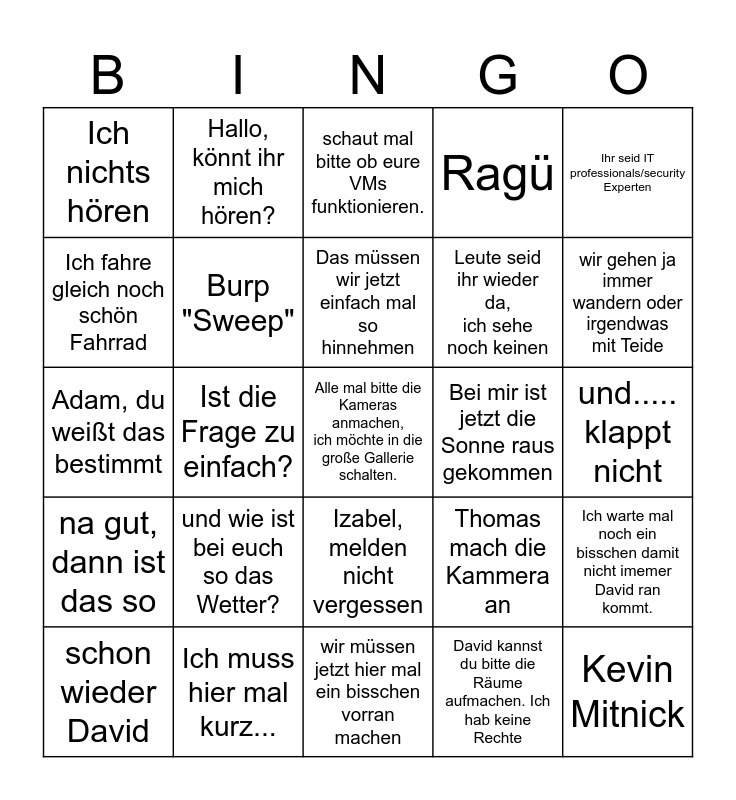 This bingo card has a free space and 24 words: und wie ist bei euch so das Wetter?, Ich muss hier mal kurz..., Das müssen wir jetzt einfach mal so hinnehmen, schon wieder David, Ihr seid IT professionals/security Experten, Ich nichts hören, Ich fahre gleich noch schön Fahrrad, Hallo, könnt ihr mich hören?, Bei mir ist jetzt die Sonne raus gekommen, Izabel, melden nicht vergessen, Leute seid ihr wieder da, ich sehe noch keinen, Adam, du weißt das bestimmt, Thomas mach die Kammera an, Ich warte mal noch ein bisschen damit nicht imemer David ran kommt., Burp "Sweep", David kannst du bitte die Räume aufmachen. Ich hab keine Rechte, und..... klappt nicht, schaut mal bitte ob eure VMs funktionieren., wir gehen ja immer wandern oder irgendwas mit Teide, Ist die Frage zu einfach?, Kevin Mitnick, na gut, dann ist das so, Ragü and wir müssen jetzt hier mal ein bisschen vorran machen.