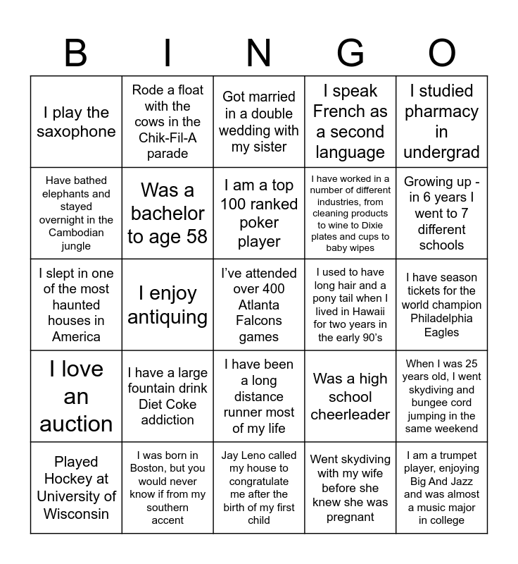 This bingo card has 31 words: Jay Leno called my house to congratulate me after the birth of my first child, I played the flute as a child, I enjoy antiquing, I was born in England and Iove all things UK (Bridgerton, Downton Abbey, Great British Baking Show, etc), I play the saxophone, Got married in a double wedding with my sister, Was a bachelor to age 58, Was a high school cheerleader, I used to have long hair and a pony tail when I lived in Hawaii for two years in the early 90’s, Went skydiving with my wife before she knew she was pregnant, I have season tickets for the world champion Philadelphia Eagles, I’ve attended over 400 Atlanta Falcons games, I am a trumpet player, enjoying Big And Jazz and was almost a music major in college, Participated in the tenth annual event, Dancing Stars of Atlanta, Growing up - in 6 years I went to 7 different schools, I was on the Merv Griffin show at age 7 for Irish Step Dancing, When I was 25 years old, I went skydiving and bungee cord jumping in the same weekend, I have a large fountain drink Diet Coke addiction, I love an auction, I have been a long distance runner most of my life, I studied pharmacy in undergrad, I am a triathlete, Played Hockey at University of Wisconsin, Rode a float with the cows in the Chik-Fil-A parade, I have worked in a number of different industries, from cleaning products to wine to Dixie plates and cups to baby wipes, Have bathed elephants and stayed overnight in the Cambodian jungle, I speak French as a second language, I slept in one of the most haunted houses in America, I was born in Boston, but you would never know if from my southern accent, I am a top 100 ranked poker player and I played the flute in high school.
