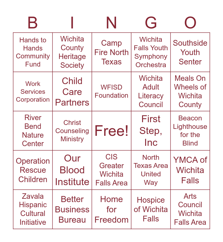 This bingo card has a free space and 30 words: Better Business Bureau, Base Camp Lindsey, Christ Counseling Ministry, Community Healthcare Center, Hands to Hands Community Fund, Camp Fire North Texas, Child Care Partners, CIS Greater Wichita Falls Area, First Step, Inc, Home for Freedom, Beacon Lighthouse for the Blind, Arts Council Wichita Falls Area, Hospice of Wichita Falls, Interfaith Outreach Services, Meals On Wheels of Wichita County, Museum of North Texas History, North Texas Area United Way, Operation Rescue Children, Our Blood Institute, Southside Youth Senter, River Bend Nature Center, TFI- 2InGage, Wichita County Heritage Society, Wichita Adult Literacy Council, Work Services Corporation, Wichita Falls Youth Symphony Orchestra, YMCA of Wichita Falls, Zavala Hispanic Cultural Initiative, WFISD Foundation and Wichita Falls Area Food Bank.
