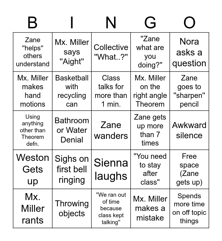 This bingo card has 26 words: Sienna laughs, Mx. Miller makes a mistake, Class talks for more than 1 min., Throwing objects, Nora asks a question, Zane ''helps'' others understand, Mx. Miller makes hand motions, Mx. Miller says ''Aight'', Awkward silence, ''You need to stay after class'', Mx. Miller on the right angle Theorem, Using anything other than Theorem defn., Free space (Zane gets up), Mx. Miller rants, Bathroom or Water Denial, Popcorn questions (Randomly chosen), ''Zane what are you doing?'', Weston Gets up, Collective ''What..?'', Zane wanders, Zane goes to ''sharpen'' pencil, ''We ran out of time because class kept talking'', Zane gets up more than 7 times, Sighs on first bell ringing, Basketball with recycling can and Spends more time on off topic things.