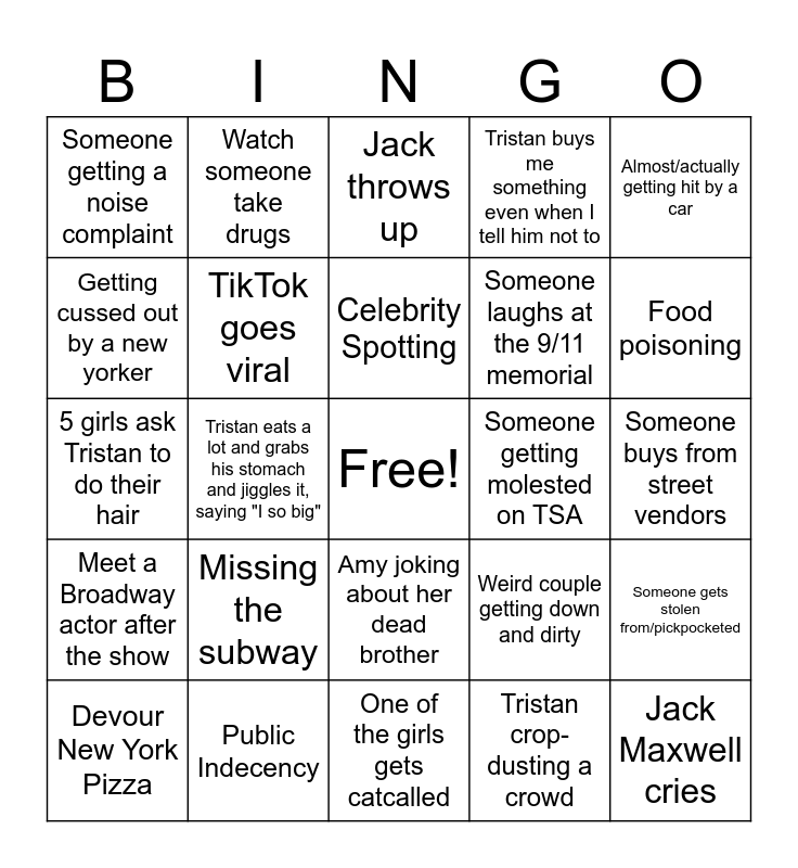 This bingo card has a free space and 24 words: Missing the subway, Public Indecency, Celebrity Spotting, Devour New York Pizza, Almost/actually getting hit by a car, Someone getting a noise complaint, Getting cussed out by a new yorker, Watch someone take drugs, Someone getting molested on TSA, Amy joking about her dead brother, Someone laughs at the 9/11 memorial, 5 girls ask Tristan to do their hair, Weird couple getting down and dirty, Someone gets stolen from/pickpocketed, TikTok goes viral, Tristan crop-dusting a crowd, Someone buys from street vendors, Jack throws up, Food poisoning, Tristan eats a lot and grabs his stomach and jiggles it, saying "I so big", Jack Maxwell cries, Meet a Broadway actor after the show, Tristan buys me something even when I tell him not to and One of the girls gets catcalled.