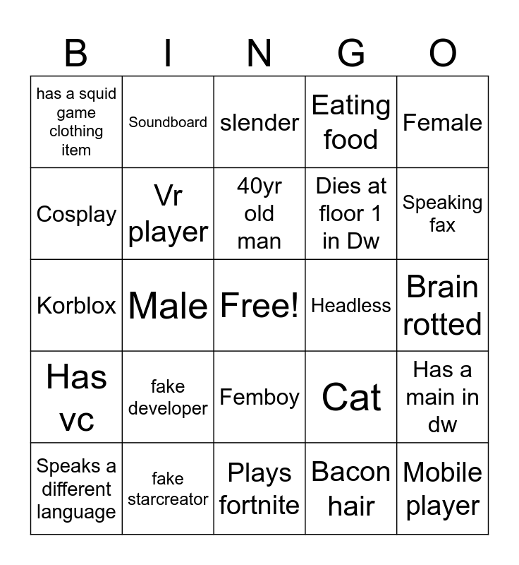 This bingo card has a free space and 24 words: fake developer, fake starcreator, 40yr old man, Speaks a different language, Female, has a squid game clothing item, Cosplay, Soundboard, Headless, Femboy, Dies at floor 1 in Dw, Korblox, Cat, Has a main in dw, Vr player, Bacon hair, Brain rotted, slender, Speaking fax, Male, Mobile player, Has vc, Eating food and Plays fortnite.