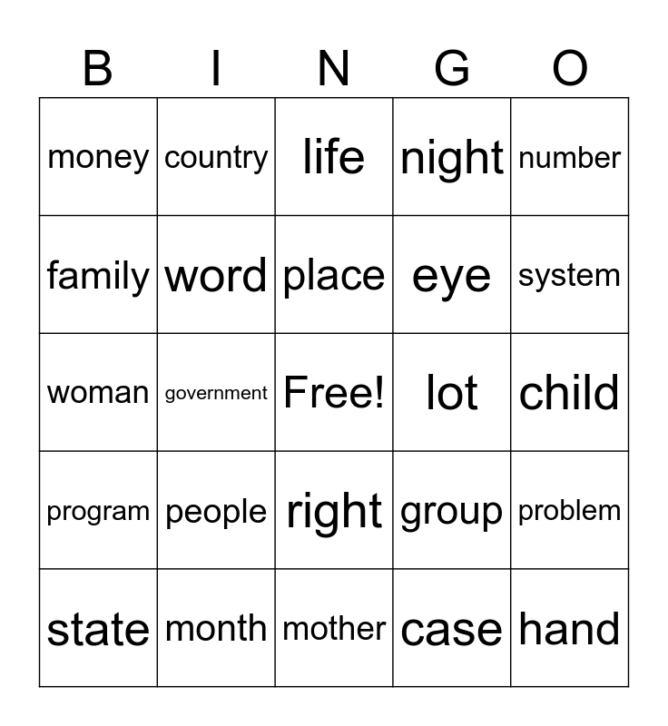 This bingo card has a free space and 49 words: area, book, business, case, child, company, country, day, eye, fact, family, government, group, hand, home, job, life, lot, man, money, month, mother, night, number, part, people, place, point, problem, program, question, right, room, school, state, story, student, study, system, thing, time, water, way, week, woman, word, work, world and year.