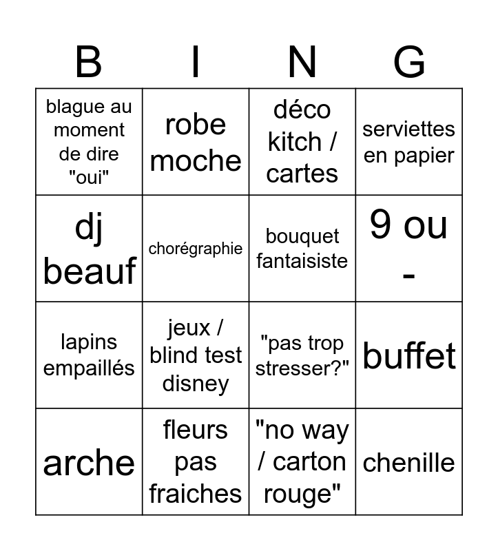 This bingo card has 16 words: fleurs pas fraiches, buffet, déco kitch / cartes, blague au moment de dire "oui", lapins empaillés, robe moche, "pas trop stresser?", "no way / carton rouge", dj beauf, chorégraphie, arche, serviettes en papier, jeux / blind test disney, 9 ou -, bouquet fantaisiste and chenille.