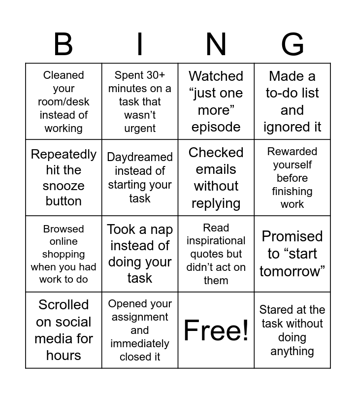 This bingo card has 17 words: Free!, Scrolled on social media for hours, Watched “just one more” episode, Cleaned your room/desk instead of working, Took a nap instead of doing your task, Made a to-do list and ignored it, Promised to “start tomorrow”, Checked emails without replying, Rewarded yourself before finishing work, Daydreamed instead of starting your task, Opened your assignment and immediately closed it, Read inspirational quotes but didn’t act on them, Repeatedly hit the snooze button, Spent 30+ minutes on a task that wasn’t urgent, Browsed online shopping when you had work to do, Took a “break” that lasted hours and Stared at the task without doing anything.