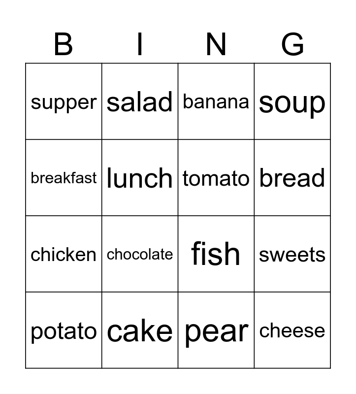 This bingo card has 24 words: Free!, sandwich, bread, eggs, breakfast, supper, lunch, salad, cake, pizza, chicken, fish, carrot, cucumber, tomato, apple, pear, banana, chocolate, sweets, potato, cheese, soup and rice.