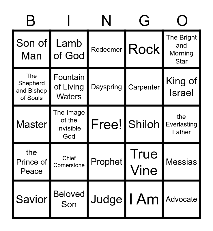 This bingo card has a free space and 51 words: Immanuel, Advocate, Mediator, Judge, Chief Cornerstone, Author and Finisher of Our Faith, Lamb of God, Good Shepherd, The Shepherd and Bishop of Souls, The Word, Fountain of Living Waters, Rock, Messias, True Vine, Branch, Bridegroom, Dayspring, Shiloh, The Lion of the Tribe of Judah, The Bright and Morning Star, The Image of the Invisible God, I Am, Son of Man, Carpenter, The Way, the Truth and the Life, King of Israel, Christ, Savior, Redeemer, Bread of Life, Lord, Creator, Son of the Living God, Only Begotten Son, Beloved Son, Holy One of Israel, Wonderful, Counsellor, the Mighty God, the Everlasting Father, the Prince of Peace, King of Kings, Head of the Church, The Almighty, Alpha and Omega, Master, King of the Jews, High Priest, Prophet and Teacher.
