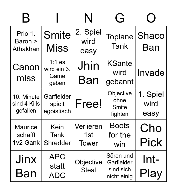 This bingo card has a free space and 24 words: Kein Tank Shredder, APC statt ADC, Jhin Ban, Jinx Ban, Shaco Ban, Prio 1. Baron > Athakhan, Canon miss, Smite Miss, Objective ohne Smite fighten, Verlieren 1st Tower, KSante wird gebannt, 10. Minute sind 4 Kills gefallen, Boots for the win, Cho Pick, 1:1 es wird ein 3. Game geben, Sören und Garfielder sind sich nicht einig, 1. Spiel wird easy, 2. Spiel wird easy, Invade, Garfielder spielt egoistisch, Int-Play, Maurice schafft 1v2 Gank, Toplane Tank and Objective Steal.