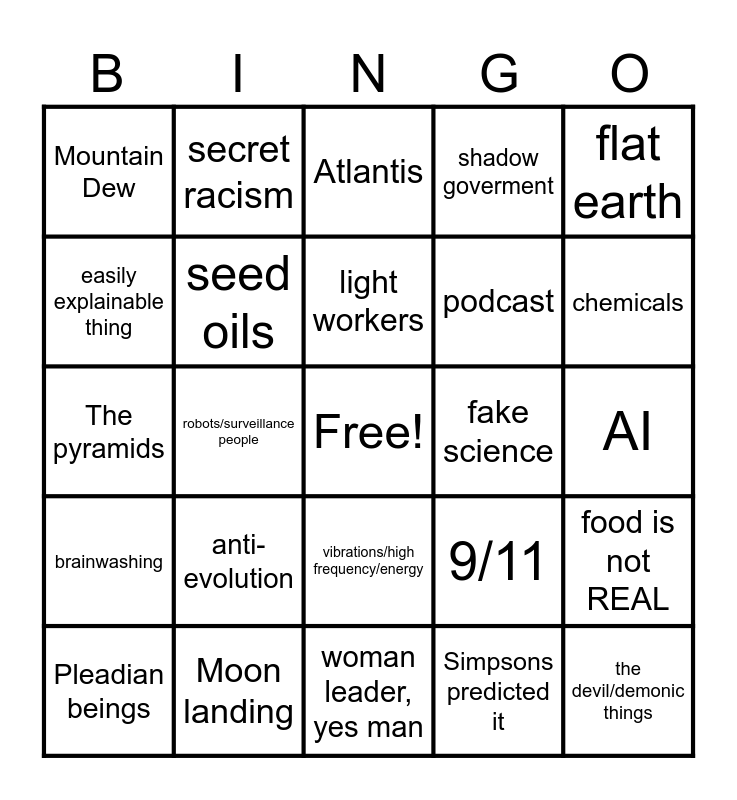 This bingo card has a free space and 39 words: reptile people, ice wall, dragons, seed oils, Pleadian beings, vibrations/high frequency/energy, light workers, telekinesis, flat earth, brainwashing, robots/surveillance people, shadow goverment, the devil/demonic things, AI, fake science, anti-evolution, ascension, Mountain Dew, surveillance water, 9/11, easily explainable thing, woman leader, yes man, podcast, chemicals, chakras, the matrix, trying to sell you something, aliens, crazy math, secret racism, insane Christianity, starseed, Atlantis, Moon landing, Simpsons predicted it, illuminati, food is not REAL, The pyramids and Emerald Thoth Tablet.