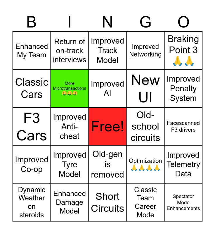 This bingo card has a free space and 24 words: Improved Tyre Model, Enhanced Damage Model, Improved AI, Dynamic Weather on steroids, Braking Point 3 🙏🙏, Enhanced My Team, Classic Cars, Return of on-track interviews, Old-school circuits, Old-gen is removed, New UI, F3 Cars, Optimization 🙏🙏🙏🙏, Improved Telemetry Data, More Microtransactions 🤑🤑🤑, Classic Team Career Mode, Facescanned F3 drivers, Improved Track Model, Improved Penalty System, Improved Anti-cheat, Spectator Mode Enhancements, Improved Co-op, Improved Networking and Short Circuits.