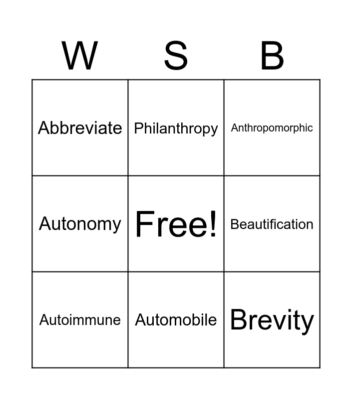This bingo card has a free space and 8 words: Beautification, Anthropomorphic, Philanthropy, Autoimmune, Abbreviate, Brevity, Autonomy and Automobile.