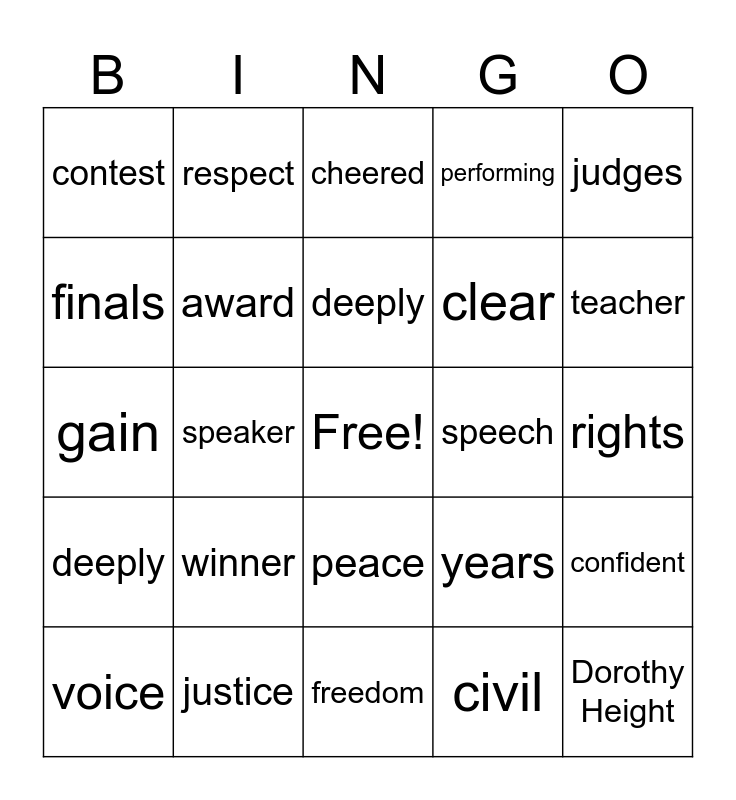 This bingo card has a free space and 24 words: winner, justice, deeply, voice, judges, contest, finals, respect, speech, peace, clear, gain, years, confident, award, civil, rights, cheered, teacher, speaker, Dorothy Height, deeply, performing and freedom.