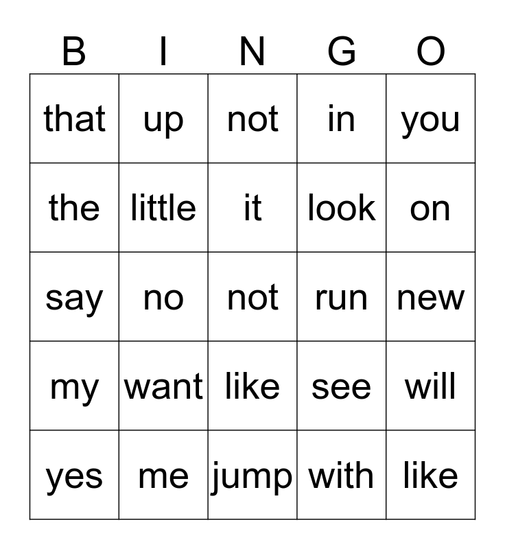 This bingo card has 25 words: want, jump, it, yes, you, that, the, up, run, like, look, say, see, will, little, like, new, not, on, no, not, me, my, in and with.