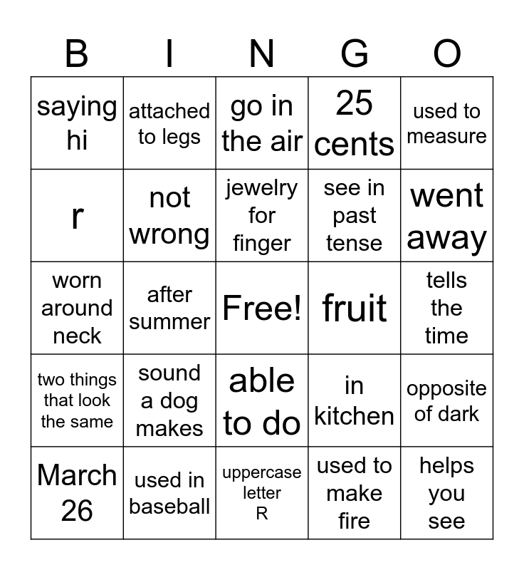 This bingo card has a free space and 24 words: sound a dog makes, used in baseball, jewelry for finger, March 26, used to measure, saying hi, r, attached to legs, fruit, able to do, see in past tense, worn around neck, in kitchen, opposite of dark, not wrong, used to make fire, tells the time, go in the air, went away, after summer, helps you see, two things that look the same, 25 cents and uppercase letter R.