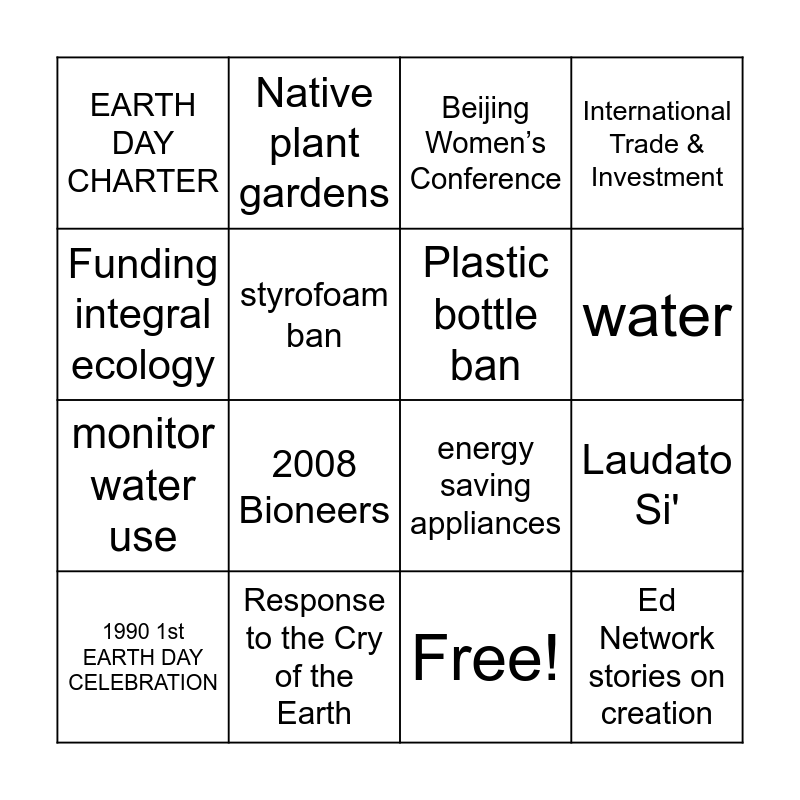 This bingo card has 17 words: Free!, 1990 1st EARTH DAY CELEBRATION, Beijing Women’s Conference, EARTH DAY CHARTER, 2008 Bioneers, International Trade & Investment, Laudato Si', Plastic bottle ban, water, styrofoam ban, Response to the Cry of the Earth, energy saving appliances, Funding integral ecology, Native plant gardens, monitor water use, OC Water district tour and Ed Network stories on creation.
