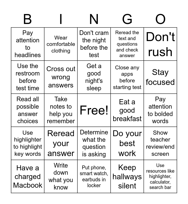 This bingo card has a free space and 33 words: Take 3 deep breaths, Have a positive attitude, Take notes to help you remember, Answer all questions, Use highlighter to highlight key words, Cross out wrong answers, Don't rush, Have a charged Macbook, Wear comfortable clothing, Relax before the test, Get a good night's sleep, Don't cram the night before the test, Work at your own pace, Be alert, Eat a good breakfast, Stay focused, Write down what you know, Read all possible answer choices, Reread your answer, Do your best work, Determine what the question is asking, Read the questions before the passage, Pay attention to headlines, Pay attention to bolded words, Put phone, smart watch, earbuds in locker, Use resources like highlighter, calculator, search bar, Reread the text and questions and check answer, Close any apps before starting test, Use the restroom before test time, Show teacher review/end screen, Work silently and be respectful of others, Keep hallways silent and Show what you know.