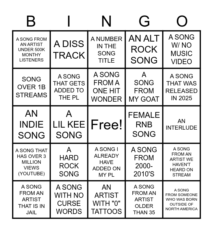 This bingo card has a free space and 24 words: A HARD ROCK SONG, A SONG WITH NO CURSE WORDS, A SONG FROM A ONE HIT WONDER, A SONG FROM AN ARTIST THAT IS IN JAIL, A SONG W/ NO MUSIC VIDEO, A SONG FROM AN ARTIST UNDER 500K MONTHY LISTENERS, SONG OVER 1B STREAMS, A DISS TRACK, FEMALE RNB SONG, A SONG I ALREADY HAVE ADDED ON MY PL, A SONG FROM MY GOAT, AN INDIE SONG, A SONG FROM 2000-2010'S, A SONG FROM AN ARTIST WE HAVEN'T HEARD ON STREAM, A SONG THAT GETS ADDED TO THE PL, A SONG FROM AN ARTIST OLDER THAN 35, AN INTERLUDE, A NUMBER IN THE SONG TITLE, A SONG THAT WAS RELEASED IN 2025, A LIL KEE SONG, A SONG FROM SOMEONE WHO WAS BORN OUTSIDE OF NORTH AMERICA, A SONG THAT HAS OVER 3 MILLION VIEWS (YOUTUBE), AN ALT ROCK SONG and AN ARTIST WITH "0" TATTOOS.