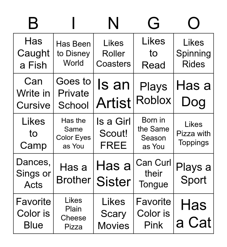 This bingo card has a free space and 24 words: Has a Brother, Likes Plain Cheese Pizza, Is an Artist, Favorite Color is Blue, Likes Spinning Rides, Has Caught a Fish, Can Write in Cursive, Has Been to Disney World, Born in the Same Season as You, Has a Sister, Plays Roblox, Likes to Camp, Can Curl their Tongue, Plays a Sport, Goes to Private School, Favorite Color is Pink, Likes Pizza with Toppings, Likes Roller Coasters, Has a Dog, Has the Same Color Eyes as You, Has a Cat, Dances, Sings or Acts, Likes to Read and Likes Scary Movies.