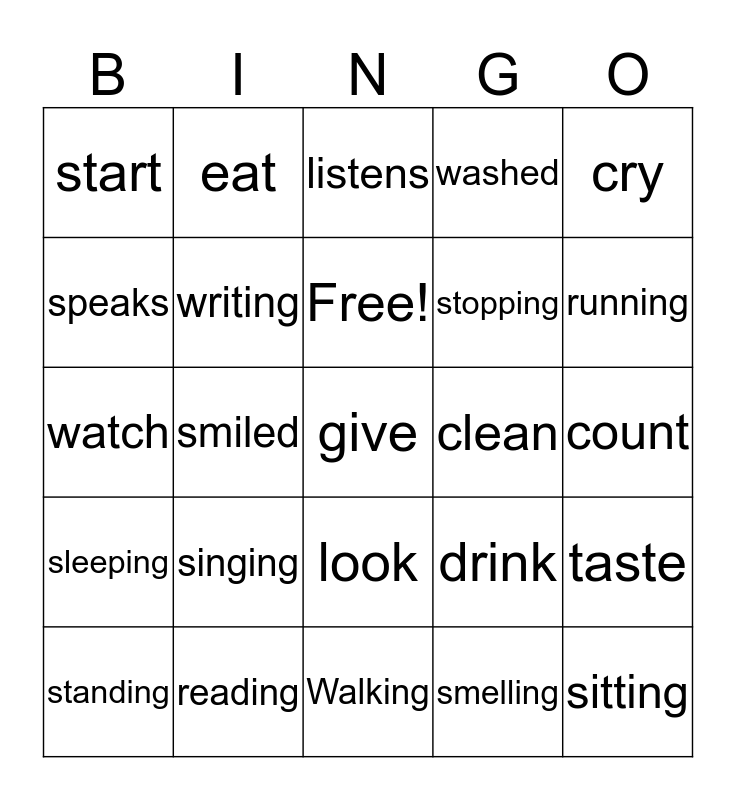 This bingo card has a free space and 25 words: singing, Walking, Free!, standing, cry, start, speaks, eat, clean, look, stopping, watch, drink, taste, writing, smelling, count, listens, running, smiled, sitting, reading, sleeping, washed and smelling.
