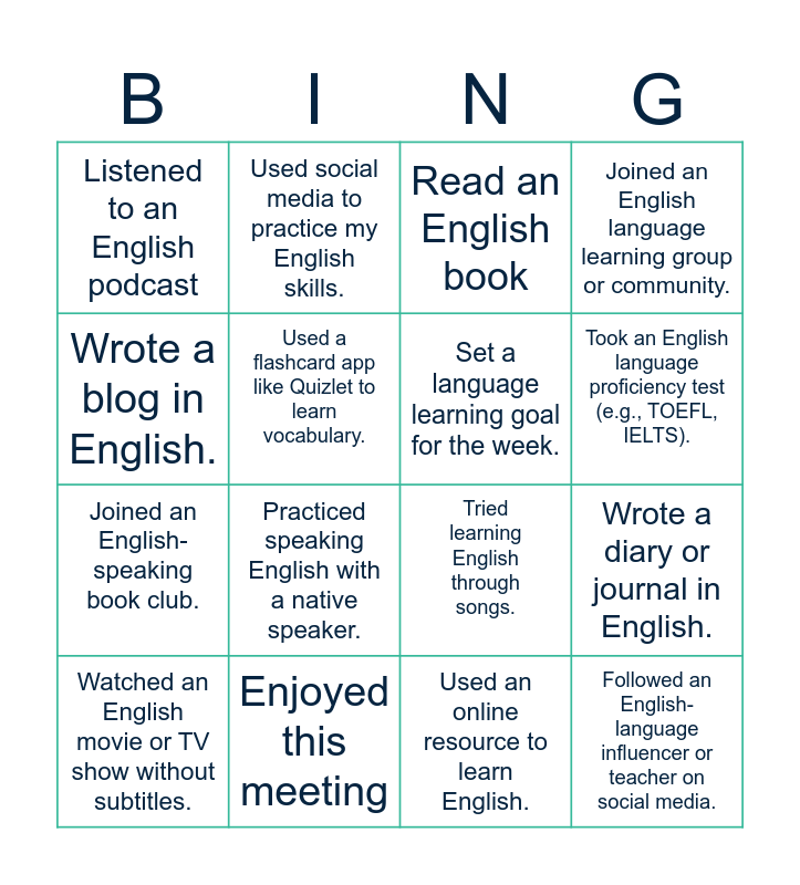This bingo card has 17 words: Used an online resource to learn English., Watched an English movie or TV show without subtitles., Read an English book, Listened to an English podcast, Practiced speaking English with a native speaker., Joined an English language learning group or community., Wrote a diary or journal in English., Set a language learning goal for the week., Took an English language proficiency test (e.g., TOEFL, IELTS)., Used a flashcard app like Quizlet to learn vocabulary., Enjoyed this meeting, Tried learning English through songs., Wrote a blog in English., Used social media to practice my English skills., Joined an English-speaking book club., ENG subtitles while watching non-English movies and Followed an English-language influencer or teacher on social media..