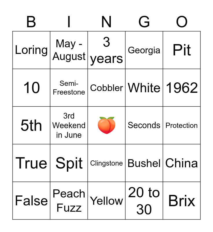 This bingo card has a free space and 28 words: China, Freestone, White, 20 to 30, 10, 3 years, May - August, True, Seconds, False, 5th, Georgia, Peach Fuzz, Yellow, 1962, LBJ, Spit, Semi-Freestone, Cobbler, Clingstone, Loring, Soil, Brix, 3rd Weekend in June, Protection, Bushel, Pit and Blossom.