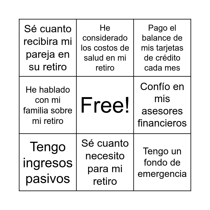 This bingo card has a free space and 20 words: He dicho "despues lo veo" cuando me hablan de mi retro, Sé la diferencia entre ahorro e inversión, Pago el balance de mis tarjetas de crédito cada mes, Sé cuanto gasto al mes, Sé cuál será mi fuente principal en mi retiro, Tengo un fondo de emergencia, Tengo un seguro de vida o incapacidad, Sé cuanto recibira mi pareja en su retiro, Tengo inversiones a largo plazo, He considerado los costos de salud en mi retiro, Tengo un plan para mantenerme activa en mi retiro, Tengo una cuenta de retiro activa IRA/401K, Confío en mis asesores financieros, Tengo un plan para asegurar el bienestar de mis hijos, Tengo ingresos pasivos, Tengo un plan de retiro, Sé cuanto necesito para mi retiro, He hablado con mi familia sobre mi retiro, Tengo un testamento actualizado and Tengo un hobby para cuanod me retire.