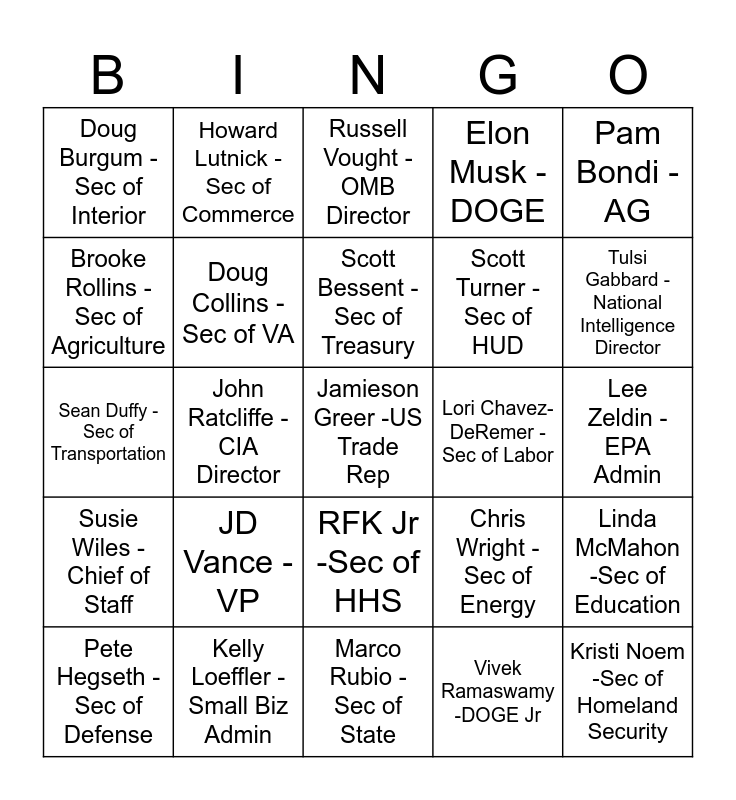 This bingo card has 25 words: JD Vance -VP, Marco Rubio -Sec of State, Scott Bessent -Sec of Treasury, Pete Hegseth -Sec of Defense, Pam Bondi - AG, Doug Burgum -Sec of Interior, Brooke Rollins -Sec of Agriculture, Howard Lutnick -Sec of Commerce, Lori Chavez-DeRemer -Sec of Labor, RFK Jr -Sec of HHS, Scott Turner -Sec of HUD, Sean Duffy -Sec of Transportation, Chris Wright -Sec of Energy, Linda McMahon -Sec of Education, Doug Collins -Sec of VA, Kristi Noem -Sec of Homeland Security, Lee Zeldin -EPA Admin, Russell Vought -OMB Director, Tulsi Gabbard -National Intelligence Director, John Ratcliffe -CIA Director, Jamieson Greer -US Trade Rep, Kelly Loeffler -Small Biz Admin, Susie Wiles -Chief of Staff, Elon Musk -DOGE and Vivek Ramaswamy -DOGE Jr.