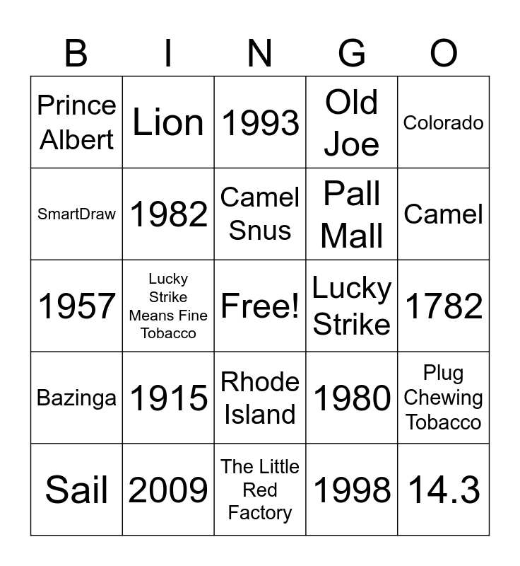 This bingo card has a free space and 25 words: 1915, The Little Red Factory, Camel Snus, Sail, Colorado, Prince Albert, SmartDraw, Lion, Lucky Strike, Rhode Island, Pall Mall, 1957, 1980, Plug Chewing Tobacco, 1982, 20, 1782, 1993, Camel, Lucky Strike Means Fine Tobacco, 14.3, 2009, Bazinga, Old Joe and 1998.