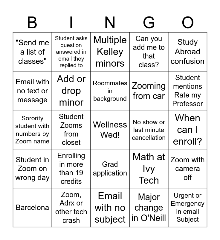 This bingo card has a free space and 29 words: Barcelona, Extended-X needed, Student Zooms from closet, O'Neill Orientation hold, "Send me a list of classes", Multiple Kelley minors, Add or drop minor, Enrolling in more than 19 credits, No show or last minute cancellation, Zoom, Adrx or other tech crash, When can I enroll?, Urgent or Emergency in email Subject, Email with no subject, Major change in O'Neill, Student mentions Rate my Professor, Landscaping noise outside, Grad application, Student in Zoom on wrong day, Study Abroad confusion, Sorority student with numbers by Zoom name, Math at Ivy Tech, Italy or Prague, Zooming from car, Email with no text or message, Can you add me to that class?, Student asks question answered in email they replied to, Zoom with camera off, Roommates in background and Internship confusion.