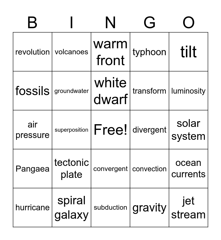 This bingo card has a free space and 24 words: tectonic plate, spiral galaxy, white dwarf, hurricane, tilt, revolution, fossils, volcanoes, divergent, convergent, transform, air pressure, convection, ocean currents, groundwater, gravity, solar system, warm front, luminosity, superposition, jet stream, Pangaea, typhoon and subduction.