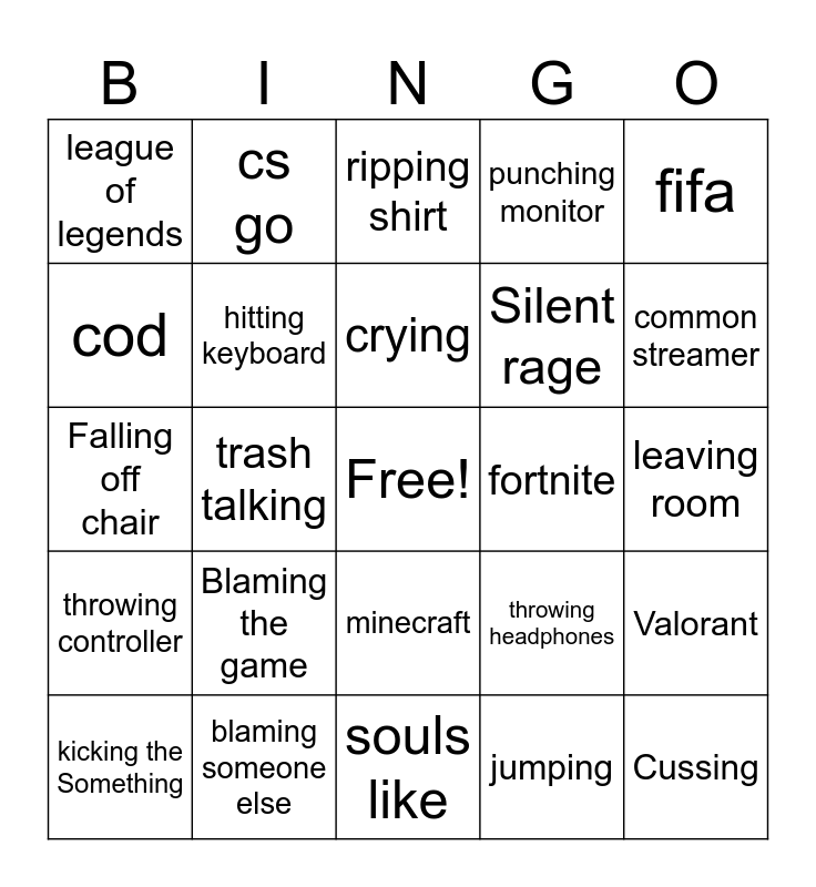 This bingo card has a free space and 24 words: Blaming the game, blaming someone else, crying, kicking the Something, fifa, league of legends, cod, cs go, fortnite, minecraft, Silent rage, Falling off chair, throwing headphones, Valorant, hitting keyboard, jumping, leaving room, ripping shirt, common streamer, trash talking, Cussing, throwing controller, punching monitor and souls like.