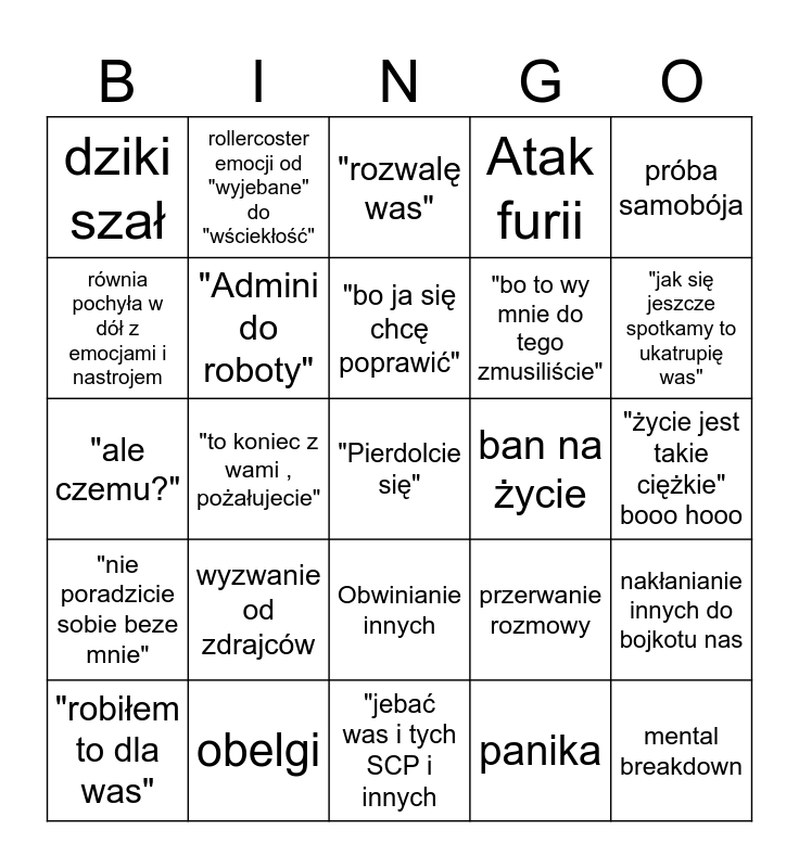 This bingo card has a free space and 24 words: wyzwanie od zdrajców, obelgi, "bo ja się chcę poprawić", "robiłem to dla was", próba samobója, dziki szał, równia pochyła w dół z emocjami i nastrojem, rollercoster emocji od "wyjebane" do "wściekłość", ban na życie, Obwinianie innych, "bo to wy mnie do tego zmusiliście", "ale czemu?", przerwanie rozmowy, nakłanianie innych do bojkotu nas, "Admini do roboty", panika, "życie jest takie ciężkie" booo hooo, "rozwalę was", "jak się jeszcze spotkamy to ukatrupię was", "to koniec z wami , pożałujecie", mental breakdown, "nie poradzicie sobie beze mnie", Atak furii and "jebać was i tych SCP i innych.