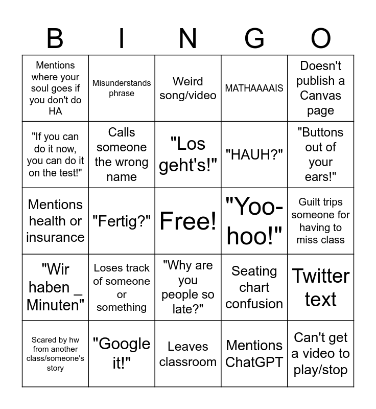 This bingo card has a free space and 28 words: Twitter text, Pop song ringtone, "HAUH?", Mentions ChatGPT, "If you can do it now, you can do it on the test!", Weird song/video, Misunderstands phrase, "Wir haben _ Minuten", "Yoo-hoo!", Scared by hw from another class/someone's story, Mentions health or insurance, MATHAAAAIS, "Google it!", Leaves classroom, "Buttons out of your ears!", Bad whiteboard marker throw, Loses track of someone or something, Calls someone the wrong name, "Los geht's!", "Why are you people so late?", Mentions where your soul goes if you don't do HA, "Gummibären oder Stampe?", Can't get a video to play/stop, "Fertig?", Guilt trips someone for having to miss class, Seating chart confusion, Doesn't publish a Canvas page and Exposes her horrible desktop.