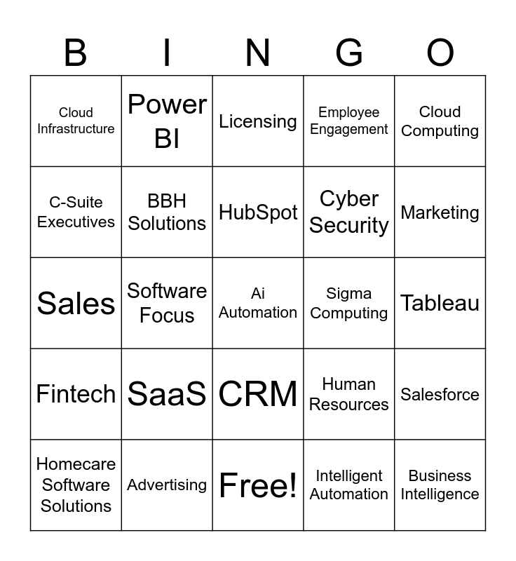 This bingo card has 29 words: Homecare Software Solutions, Freemium Model, Software Focus, Business Intelligence, Cloud Infrastructure, Licensing, BBH Solutions, SaaS, Sigma Computing, Advertising, Tableau, Ai Automation, Free!, Intelligent Automation, Marketing, Exigent Technologies, CRM, Fintech, Cloud Computing, Sales, Human Resources, Fintech, Cyber Security, C-Suite Executives, Employee Engagement, Power BI, Salesforce, HubSpot and Zoom.