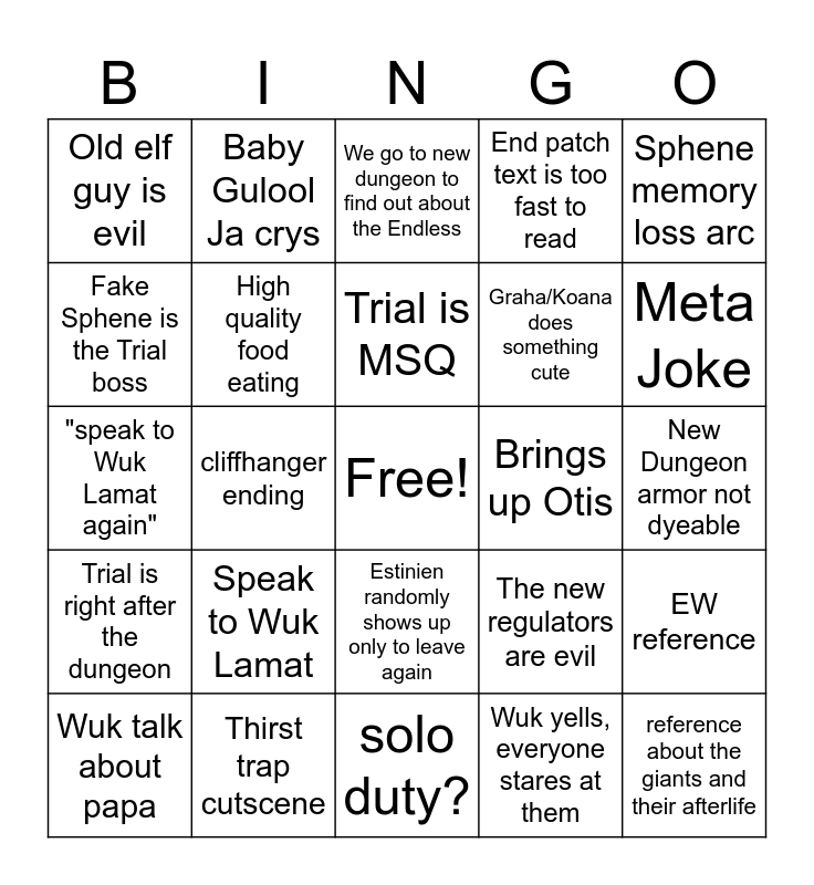 This bingo card has a free space and 24 words: Speak to Wuk Lamat, Thirst trap cutscene, Trial is MSQ, Wuk talk about papa, Sphene memory loss arc, Old elf guy is evil, Fake Sphene is the Trial boss, Baby Gulool Ja crys, Brings up Otis, Estinien randomly shows up only to leave again, Graha/Koana does something cute, "speak to Wuk Lamat again", The new regulators are evil, EW reference, High quality food eating, Wuk yells, everyone stares at them, New Dungeon armor not dyeable, We go to new dungeon to find out about the Endless, Meta Joke, cliffhanger ending, reference about the giants and their afterlife, Trial is right after the dungeon, End patch text is too fast to read and solo duty?.