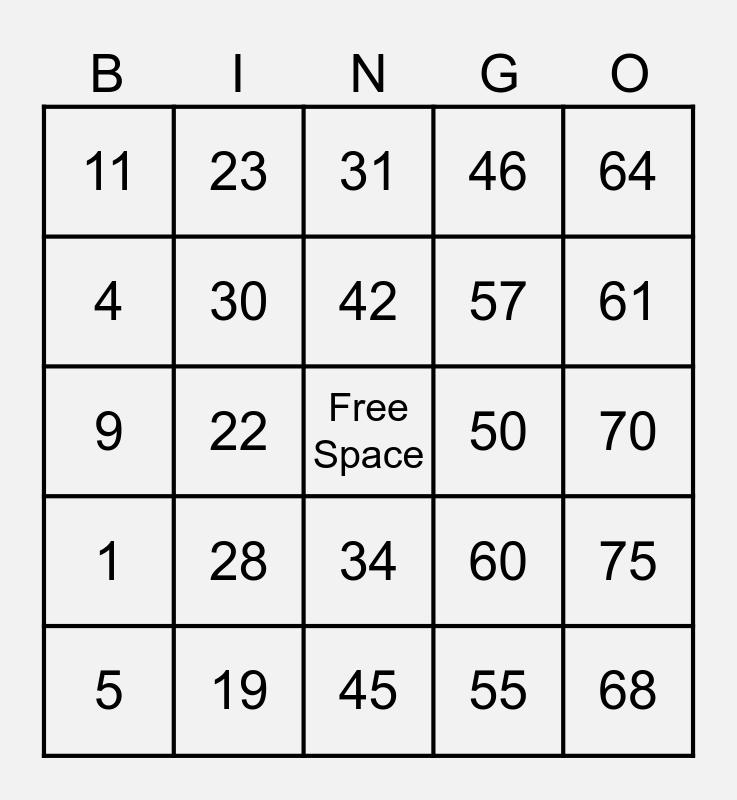 This bingo card has a free space and 24 words: 5, 28, 42, 55, 64, 11, 23, 31, 50, 70, 9, 30, 60, 75, 4, 19, 45, 46, 61, 1, 22, 34, 57 and 68.