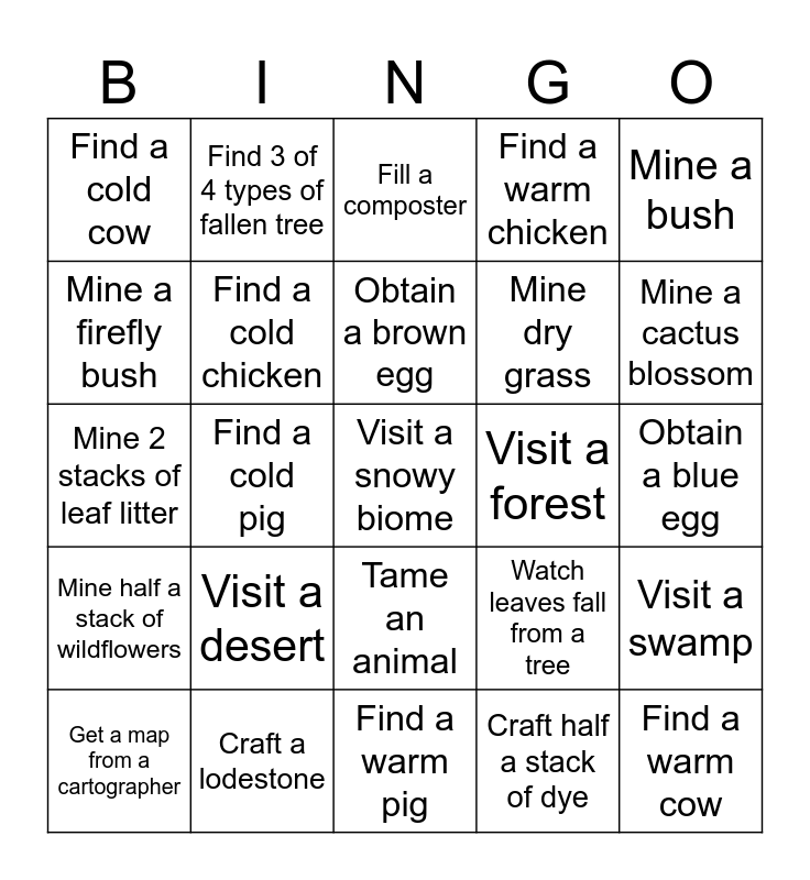 This bingo card has 25 words: Visit a desert, Find a warm pig, Obtain a brown egg, Get a map from a cartographer, Mine a bush, Find a cold cow, Mine a firefly bush, Find 3 of 4 types of fallen tree, Visit a forest, Tame an animal, Mine dry grass, Mine 2 stacks of leaf litter, Watch leaves fall from a tree, Visit a swamp, Find a cold chicken, Find a warm cow, Obtain a blue egg, Fill a composter, Mine a cactus blossom, Find a cold pig, Visit a snowy biome, Craft a lodestone, Mine half a stack of wildflowers, Find a warm chicken and Craft half a stack of dye.