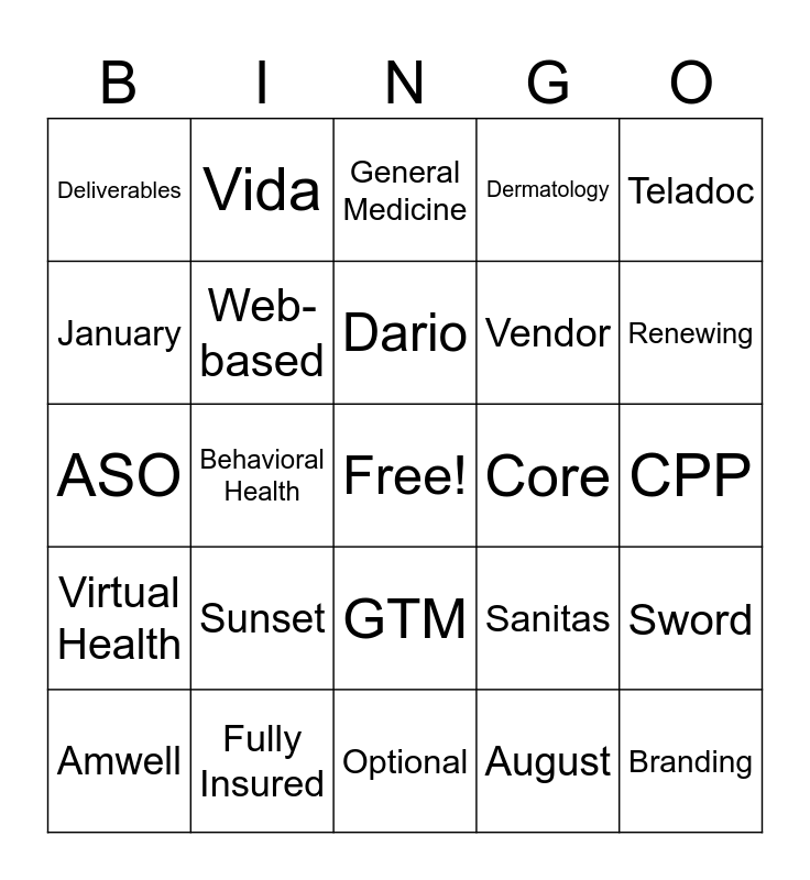 This bingo card has a free space and 29 words: Amwell, Hello Heart, Behavioral Health, Ops Readiness, Deliverables, General Medicine, Web-based, Sunset, Core, Fully Insured, CPP, Branding, Optional, August, Renewing, myBlue, GTM, Virtual Health, Teladoc, ASO, Sanitas, Secondary, Vendor, January, Dermatology, Vida, Sword, Dario and Solution.
