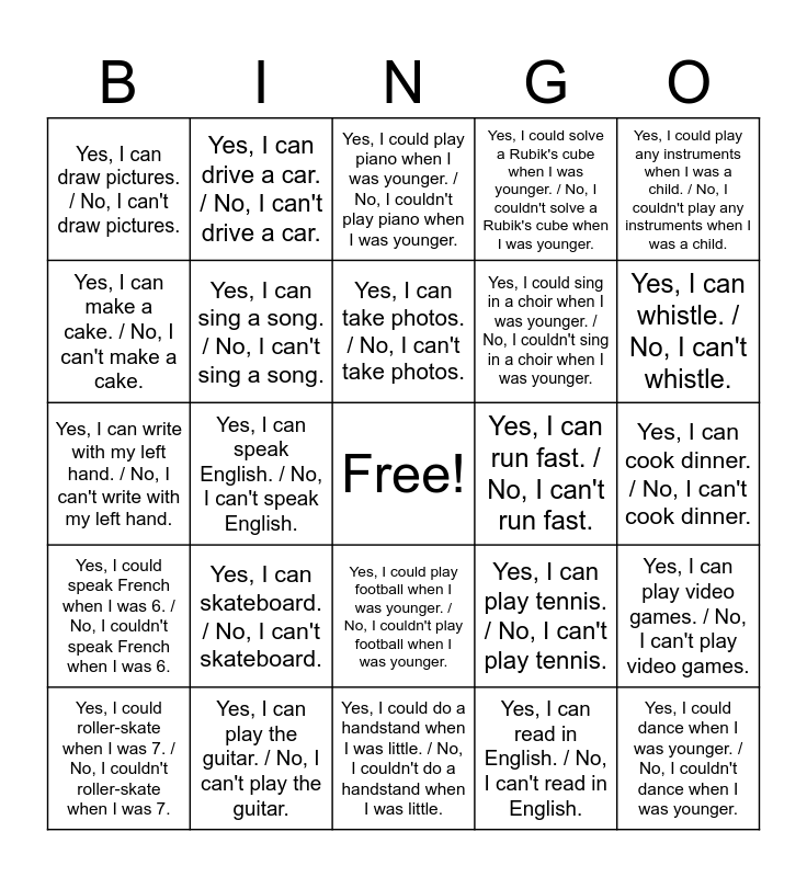 This bingo card has a free space and 30 words: Yes, I can play the guitar. / No, I can't play the guitar., Yes, I could ride a bike when I was 5. / No, I couldn't ride a bike when I was 5., Yes, I can speak English. / No, I can't speak English., Yes, I could swim when I was a child. / No, I couldn't swim when I was a child., Yes, I can draw pictures. / No, I can't draw pictures., Yes, I could play piano when I was younger. / No, I couldn't play piano when I was younger., Yes, I can sing a song. / No, I can't sing a song., Yes, I could play football when I was younger. / No, I couldn't play football when I was younger., Yes, I can run fast. / No, I can't run fast., Yes, I could do a handstand when I was little. / No, I couldn't do a handstand when I was little., Yes, I can cook dinner. / No, I can't cook dinner., Yes, I could dance when I was younger. / No, I couldn't dance when I was younger., Yes, I can read in English. / No, I can't read in English., Yes, I could play chess when I was younger. / No, I couldn't play chess when I was younger., Yes, I can whistle. / No, I can't whistle., Yes, I could ride a skateboard when I was a child. / No, I couldn't ride a skateboard when I was a child., Yes, I can play tennis. / No, I can't play tennis., Yes, I could speak French when I was 6. / No, I couldn't speak French when I was 6., Yes, I can skateboard. / No, I can't skateboard., Yes, I could play any instruments when I was a child. / No, I couldn't play any instruments when I was a child., Yes, I can write with my left hand. / No, I can't write with my left hand., Yes, I could tie my shoes when I was 3. / No, I couldn't tie my shoes when I was 3., Yes, I can drive a car. / No, I can't drive a car., Yes, I could sing in a choir when I was younger. / No, I couldn't sing in a choir when I was younger., Yes, I can make a cake. / No, I can't make a cake., Yes, I could solve a Rubik's cube when I was younger. / No, I couldn't solve a Rubik's cube when I was younger., Yes, I can play video games. / No, I can't play video games., Yes, I could roller-skate when I was 7. / No, I couldn't roller-skate when I was 7., Yes, I can take photos. / No, I can't take photos. and Yes, I could swim in the sea when I was a child. / No, I couldn't swim in the sea when I was a child..