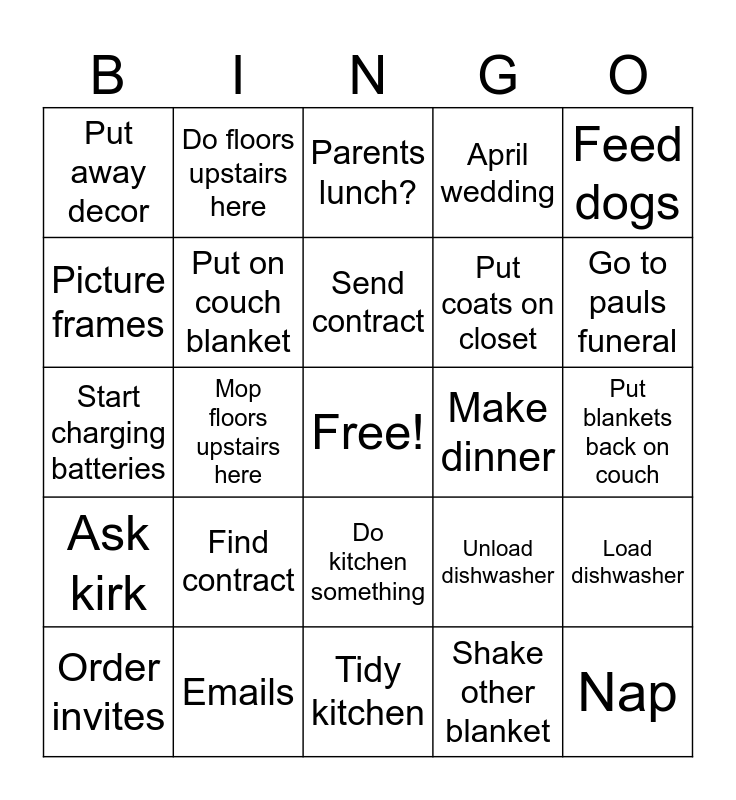 This bingo card has a free space and 24 words: Find contract, Emails, Send contract, Order invites, Feed dogs, Put away decor, Picture frames, Do floors upstairs here, Make dinner, Do kitchen something, Put coats on closet, Start charging batteries, Unload dishwasher, Load dishwasher, Put on couch blanket, Shake other blanket, Put blankets back on couch, Parents lunch?, Go to pauls funeral, Mop floors upstairs here, Nap, Ask kirk, April wedding and Tidy kitchen.