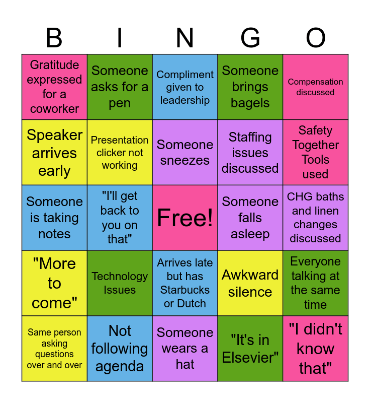 This bingo card has a free space and 24 words: Technology Issues, Not following agenda, Someone sneezes, Same person asking questions over and over, Compensation discussed, Gratitude expressed for a coworker, Speaker arrives early, Someone asks for a pen, Someone falls asleep, Arrives late but has Starbucks or Dutch, Staffing issues discussed, Someone is taking notes, Awkward silence, Everyone talking at the same time, Presentation clicker not working, "It's in Elsevier", CHG baths and linen changes discussed, Compliment given to leadership, Safety Together Tools used, "I'll get back to you on that", "I didn't know that", "More to come", Someone brings bagels and Someone wears a hat.