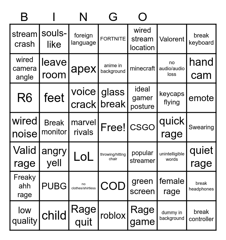 This bingo card has a free space and 62 words: eating mic, wired noise, slam desk, feet, break controller, break headphones, break keyboard, destroy clothes, leave room, low quality, FORTNITE, COD, Valorent, CSGO, sports game, stream crash, no audio/audio loss, wired stream location, Geometry Dash, wired camera angle, hand cam, foreign language, emote, marvel rivals, destiny, popular streamer, angry yell, angry rant, keycaps flying, quiet rage, racing game, no clothes/shirtless, dummy in background, hitting self, R6, souls-like, green screen, unintelligible words, minecraft, quick rage, anime in background, female rage, voice crack, angry laugh, apex, ideal gamer posture, LoL, child, roblox, Rage game, glass break, Break monitor, Overwatch, PUBG, Nintendo, Swearing, throwing/hitting chair, Freaky ahh rage, Rage quit, Throwing controller, Valid rage and Off camera rage.