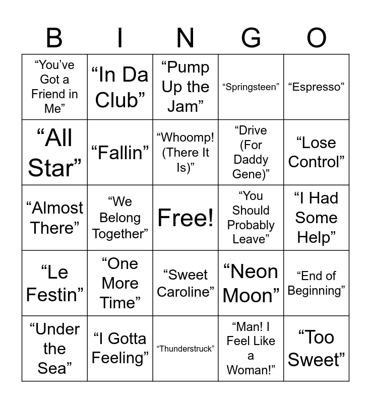 This bingo card has a free space and 74 words: “Let It Go”, “Hey Ya”, “Whoomp! (There It Is)”, “Mountain Music”, “Not Like Us”, “A Whole New World”, “Umbrella”, “I Like To Move It”, “Fancy”, “Good Luck, Babe!”, “Under the Sea”, “Crazy In Love”, “Drive (For Daddy Gene)”, “Espresso”, “Beauty and the Beast”, “I Gotta Feeling”, “Y.M.C.A.”, “You Should Probably Leave”, “Texas Hold ‘Em”, “You’ve Got a Friend in Me”, “We Belong Together”, “Pump Up the Jam”, “Springsteen”, “I Had Some Help”, “All Star”, “Crazy”, “We Will Rock You”, “Take Me Home, Country Roads”, “Birds of a Feather”, “Hakuna Matata”, “Fallin”, “Sandstorm”, “Mean”, “Million Dollar Baby”, “Everything is Awesome”, “Poker Face”, “Jump Around”, “Amarillo By Morning”, “Too Sweet”, “Happy”, “Lose Yourself”, “Sweet Caroline”, “I Walk the Line”, “We Can’t Be Friends”, “Can’t Stop the Feeling”, “In Da Club”, “All I Do Is Win”, “Jolene”, “Die With a Smile”, “Life is a Highway”, “Since U Been Gone”, “Welcome to the Jungle”, “Neon Moon”, “Saturn”, “We Don’t Talk About Bruno”, “Cry Me A River”, “Thunderstruck”, “Friends in Low Places”, “Beautiful Things”, “Le Festin”, “One More Time”, “Eye of the Tiger”, “Man! I Feel Like a Woman!”, “End of Beginning”, “Almost There”, “Milkshake”, “It Takes Two”, “Goodbye Earl”, “Lose Control”, “Hawaiian Rollercoaster Ride”, “Toxic”, “Enter Sandman”, “The Gambler” and “Stick Season”.