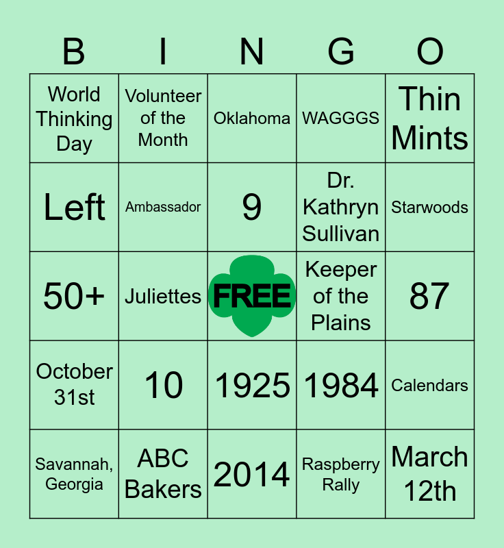 This bingo card has a free space and 39 words: 1912, Toast-Yay!, Daisy, Ambassador, Savannah, Georgia, 1925, 9, Gold Award, Thin Mints, October 31st, Juliettes, WAGGGS, March 12th, 87, Keeper of the Plains, 10, Festival of Giving, World Thinking Day, 2008, 1984, Left, 2014, Dr. Kathryn Sullivan, Starwoods, Double E, Bridging, IGNITE, 112, 3rd, Volunteer of the Month, Spark, Panda, Oklahoma, ABC Bakers, Raspberry Rally, Haunted Stroll, Calendars, 50+ and GS Cookie Program.