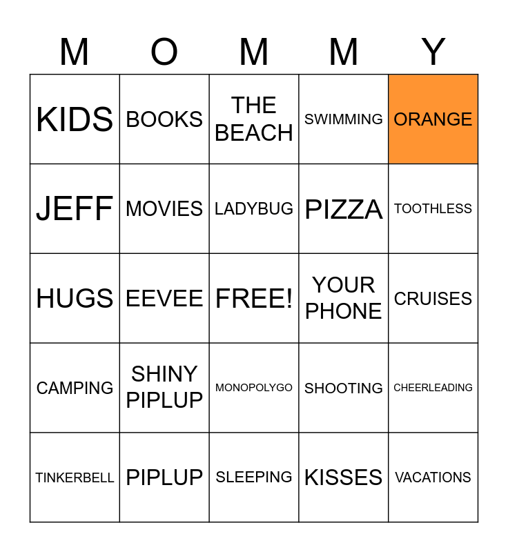 This bingo card has a free space and 24 words: SHINY PIPLUP, PIPLUP, LADYBUG, TINKERBELL, ORANGE, KIDS, JEFF, BOOKS, YOUR PHONE, MONOPOLYGO, PIZZA, HUGS, SHOOTING, CHEERLEADING, MOVIES, KISSES, CRUISES, THE BEACH, TOOTHLESS, EEVEE, VACATIONS, CAMPING, SWIMMING and SLEEPING.