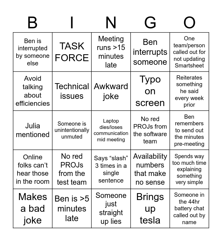 This bingo card has 41 words: Unrealistic expectations, Julia mentioned, 70% energy efficiency, Technical issues, Ben is >5 minutes late, Says “slash” 3 times in a single sentence, Awkward joke, “Be sure to update Smartsheet”, One team/person called out for not updating Smartsheet, Online folks can’t hear those in the room, Someone is unintentionally unmuted, Ben interrupts someone, Laptop dies/loses communication mid meeting, Ben remembers to send out the minutes pre-meeting, No red PROJs from the software team, No red PROJs from the test team, Ben goes on a tangent, Ben is interrupted by someone else, Meeting runs late, Meeting runs >15 minutes late, Spends way too much time explaining something very simple, Someone in the 44hr battery chat called out by name, Someone just straight up lies, Typo on screen, >5 chat messages during the meeting, >5 chat messages during the meeting with no follow-ups, Brings up tesla, Folks in the room can’t hear folks online, Reiterates something he said every week prior, Brings up electrolyte that breaks the laws of solubility (3.5-4M Fe), Over-explains a project to everyone, TASK FORCE, Makes a bad joke, John K. Takes over the meeting, Availability numbers that make no sense, Avoid talking about efficiencies, Your name gets mentioned, Ben says something inappropriate, Stacey insists on living in reality, Rolling cleaning cycles mentioned and Ben asks someone a question and they don't answer.